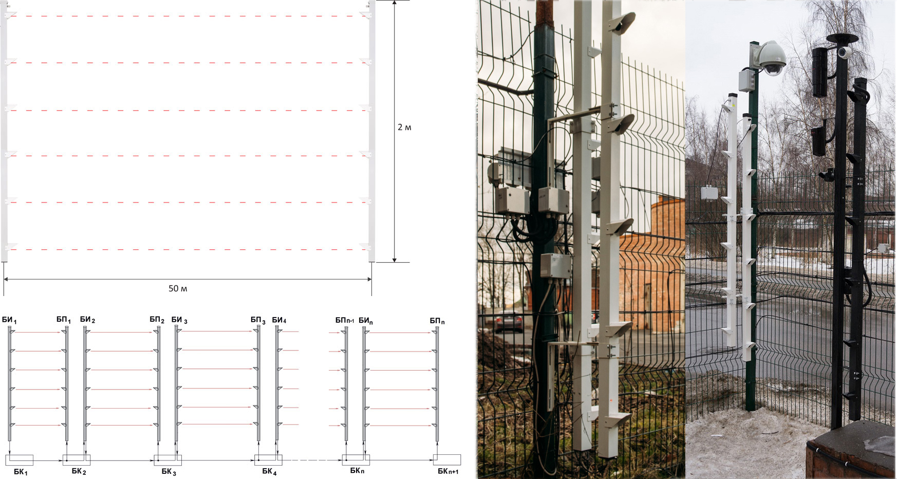 | Инфракрасный активный (ИВА, ТИС, ИКС) | Создание протяженных зон охраны без полосы отчуждения с возможностью контроля переброса и перелаза без касания ограждения |