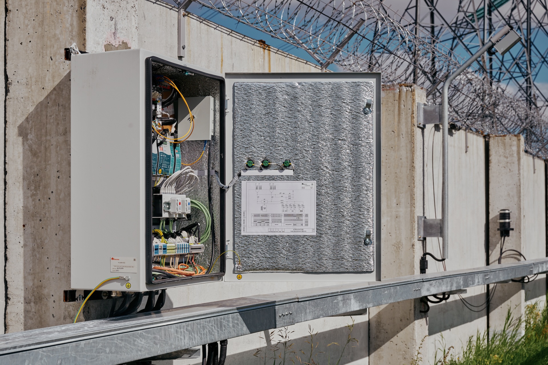 | Монолитное ограждение (бетон, кирпич). Есть второй уровень ограждения (колючая лента, сминаемый козырек). Есть полоса отчуждения | Вибрационная система (БОС-ВО, БОС-Ц, БОС-1) на втором уровне + пассивные ИК датчики (ИД) + противоподкоп (БОС-ВО, БОС-1) |
