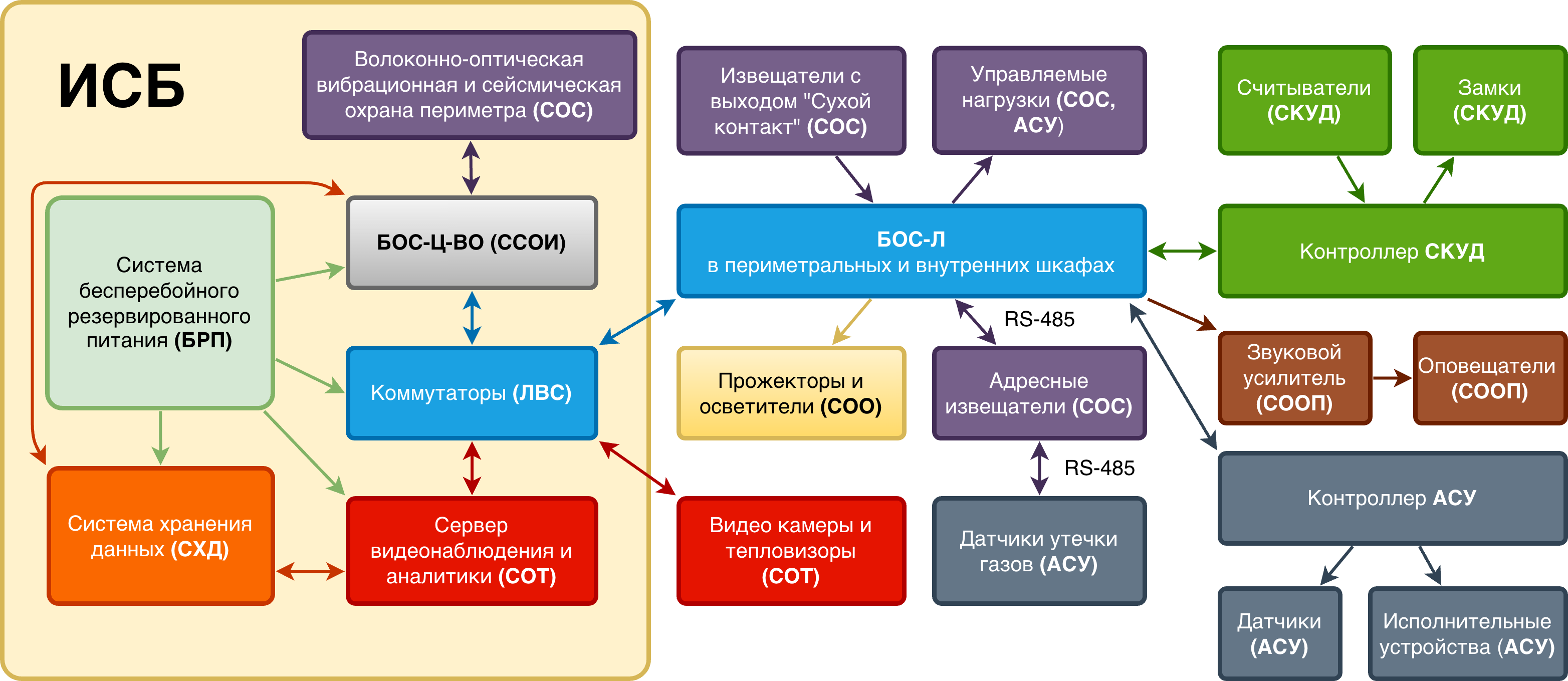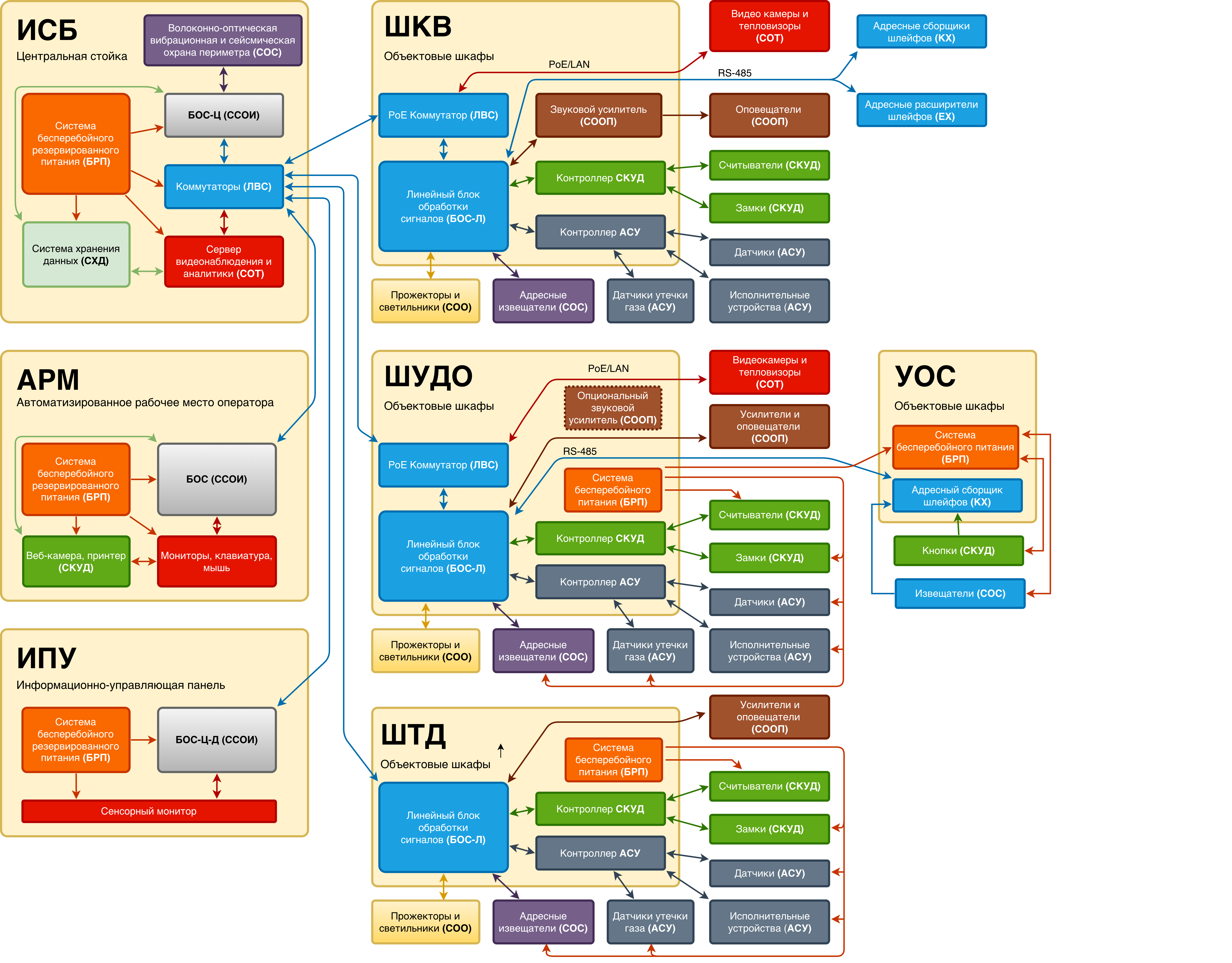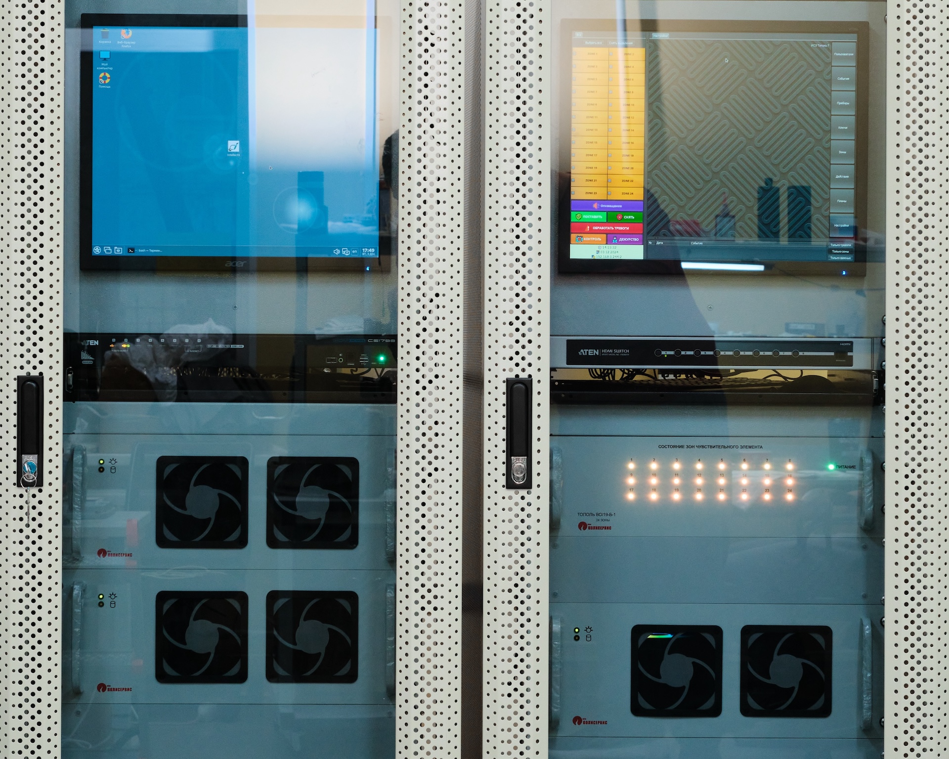 • стойки ИСБ обеспечивают полный функционал системы (система сбора и обработки информации, периметральная и внутренняя охрана, речевое оповещение, контроль и управление доступом, видеонаблюдение);