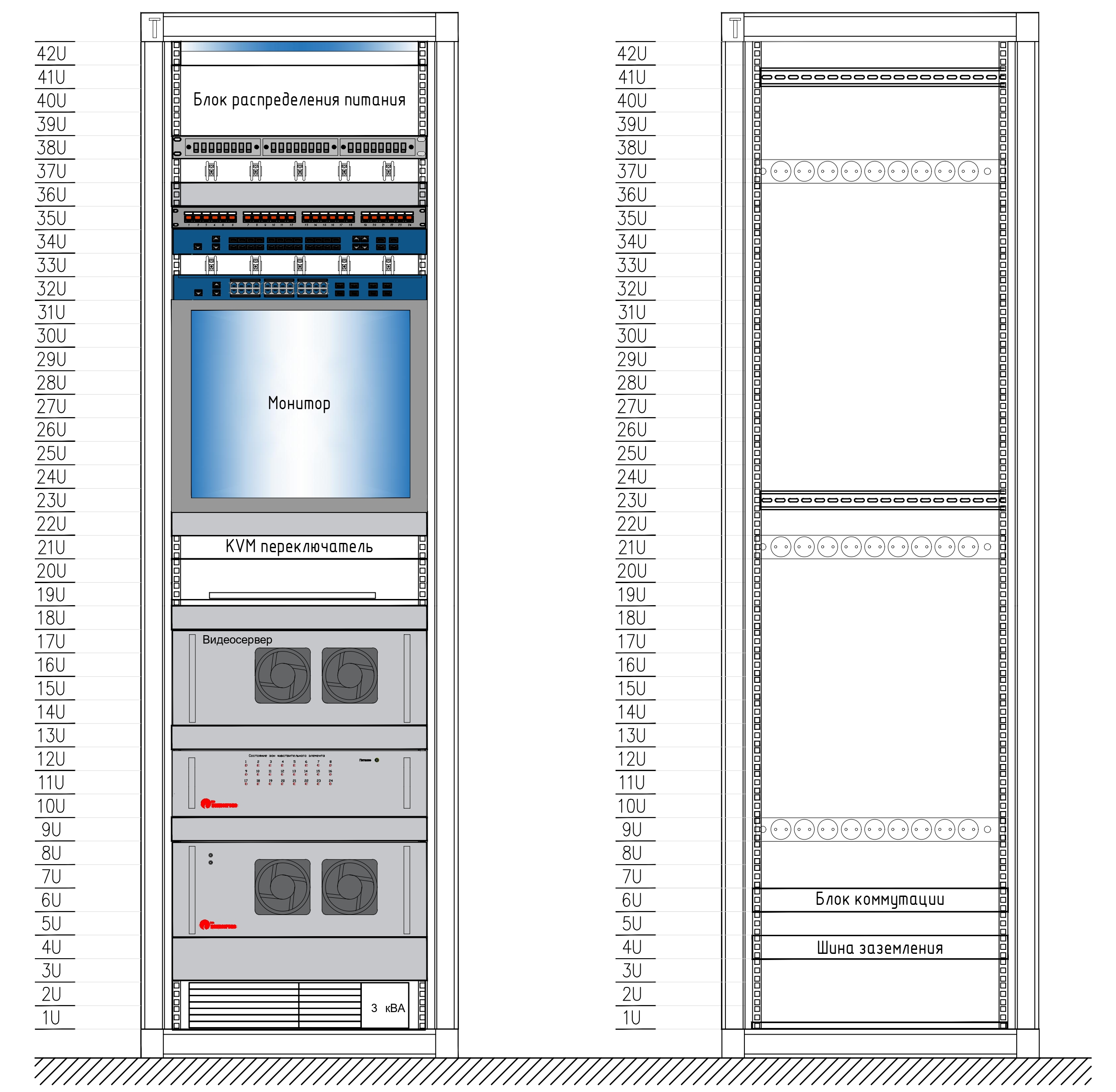 Пример конфигурации стойки ИСБ с оптоволоконным блоком обработки сигналов, резервным блоком обработки сигналов, монитором, KVM переключателем и местом для установки серверов видеонаблюдения.