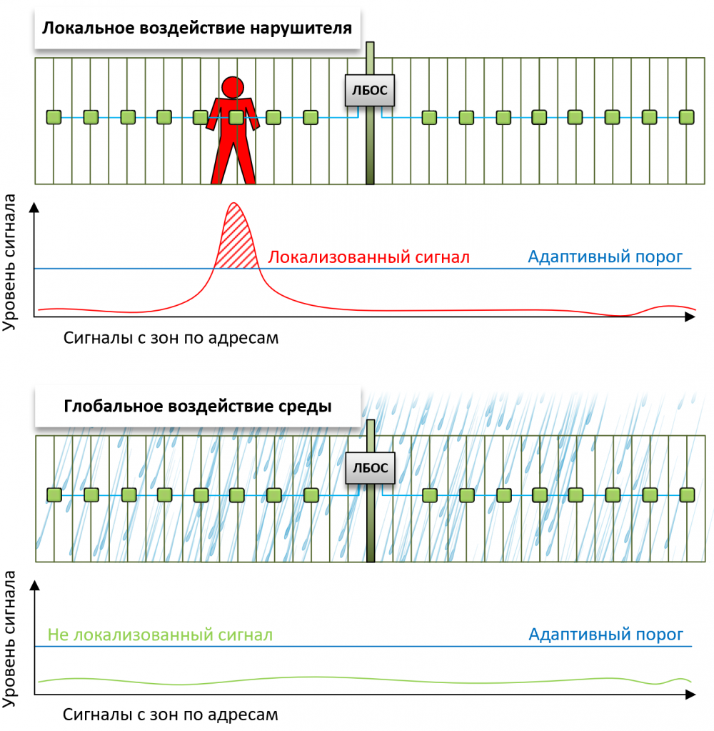 • пространственно-временной анализ сигналов от зон - позволяет определить локализацию воздействий реального нарушителя на ограниченный участок ограждения на фоне глобальных погодных помех, таких как сильный град, ливень, ураган, воздействующих на несколько зон одновременно.